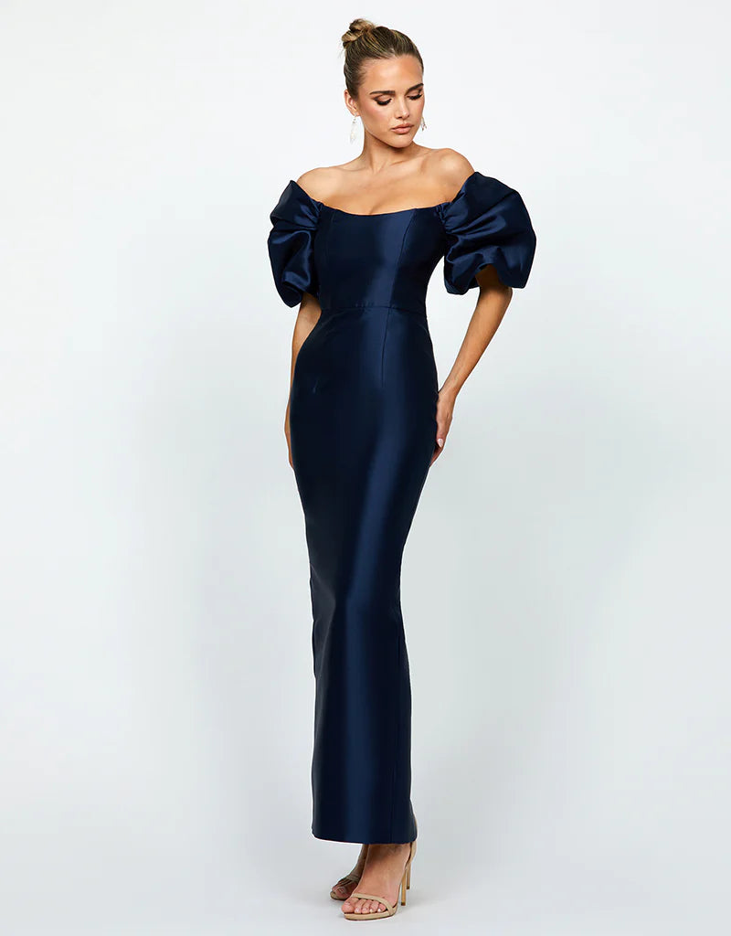 Turn heads with our flirty full-length column dress, designed to make you feel effortlessly glamorous. The slight scooped off-shoulder neckline playfully showcases your shoulders, while the short elasticated puff sleeves add a sweet, flirtatious touch. The off-body column skirt flows with a carefree elegance, featuring a cheeky back split that adds just the right amount of sass. Fully lined for your comfort, this dress glides smoothly over your curves, with an invisible zip closure at the back for a flawless finish. Made from luxurious Printed Duchess Satin adorned with a charming flower print, this dress is perfect for making a stylish statement with a touch of playful allure.