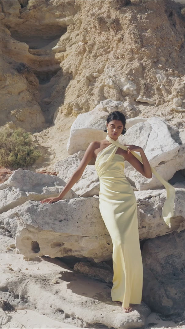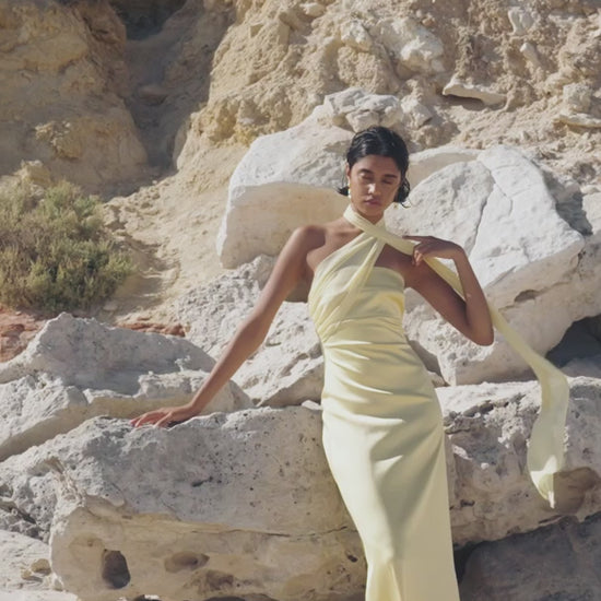 The Hali Dress features an elegant straight silhouette with a neck scarf designed to wrap around your neck or throw over your shoulder. Cut from our midweight stretch satin this is the perfect dress for any special occasion.