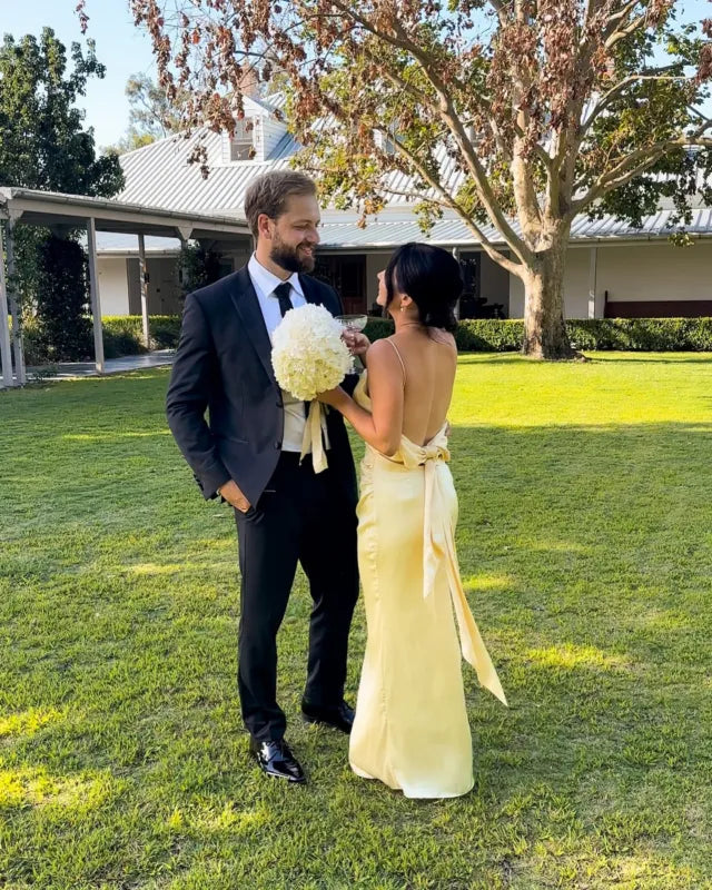 The Venus dress is cut from a luxe, heavyweight recycled satin. It features delicate gathers at the waist and and a slight mermaid skirt. The straight neckline with simple spaghetti straps eventuate into a scooped back design with a free flowing sash that can be tied into a knot or bow at the waist.