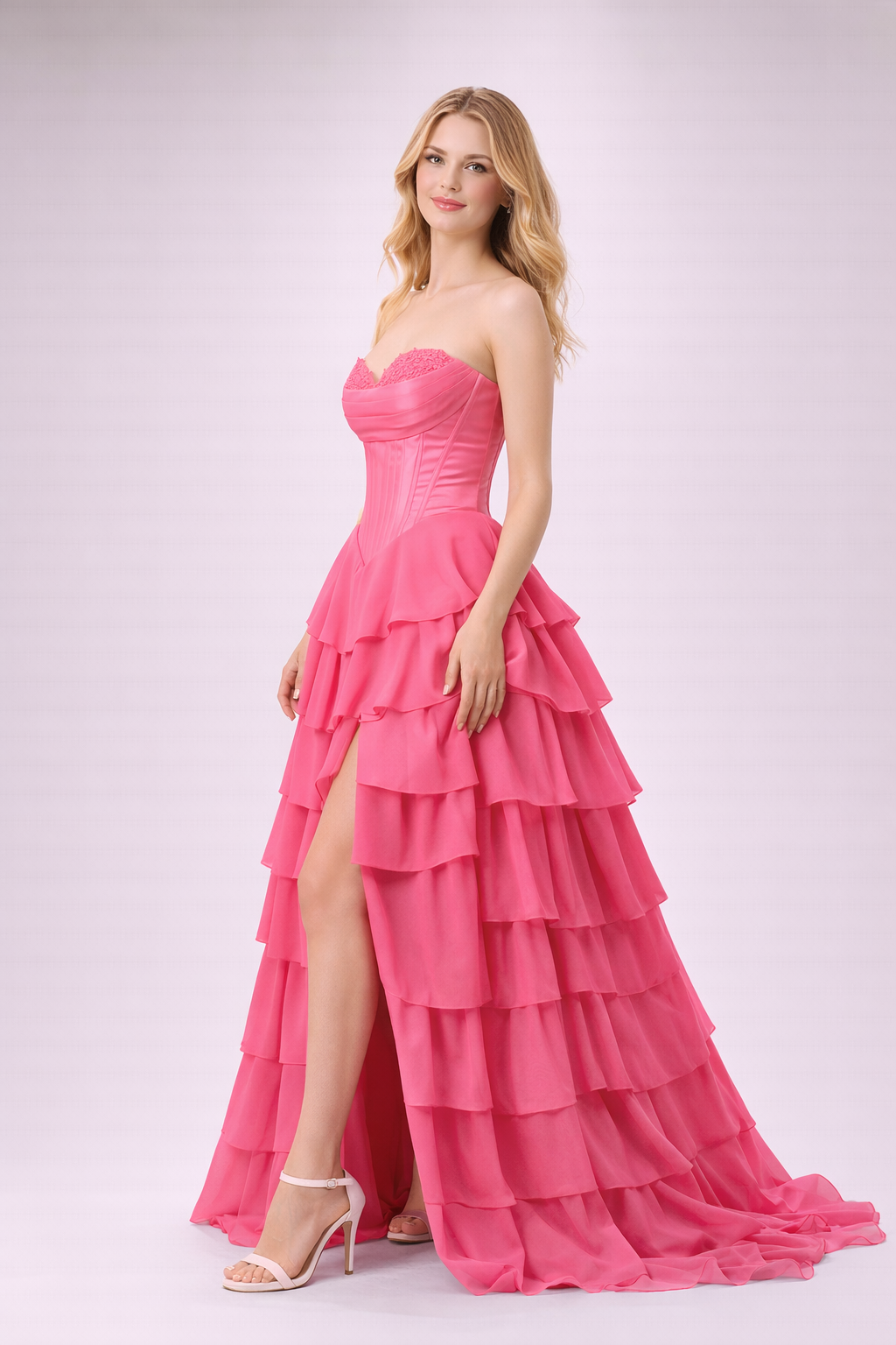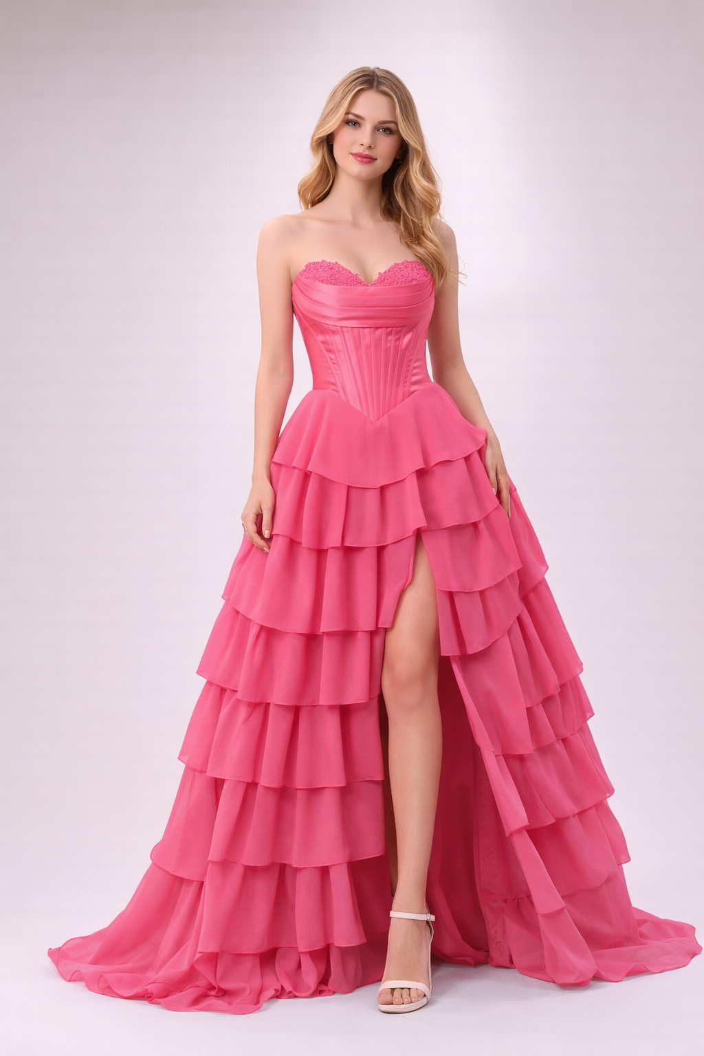 This gown has a corset back, allowing for size adjustability. If you’re between sizes, we recommend sizing down for a more secure fit.